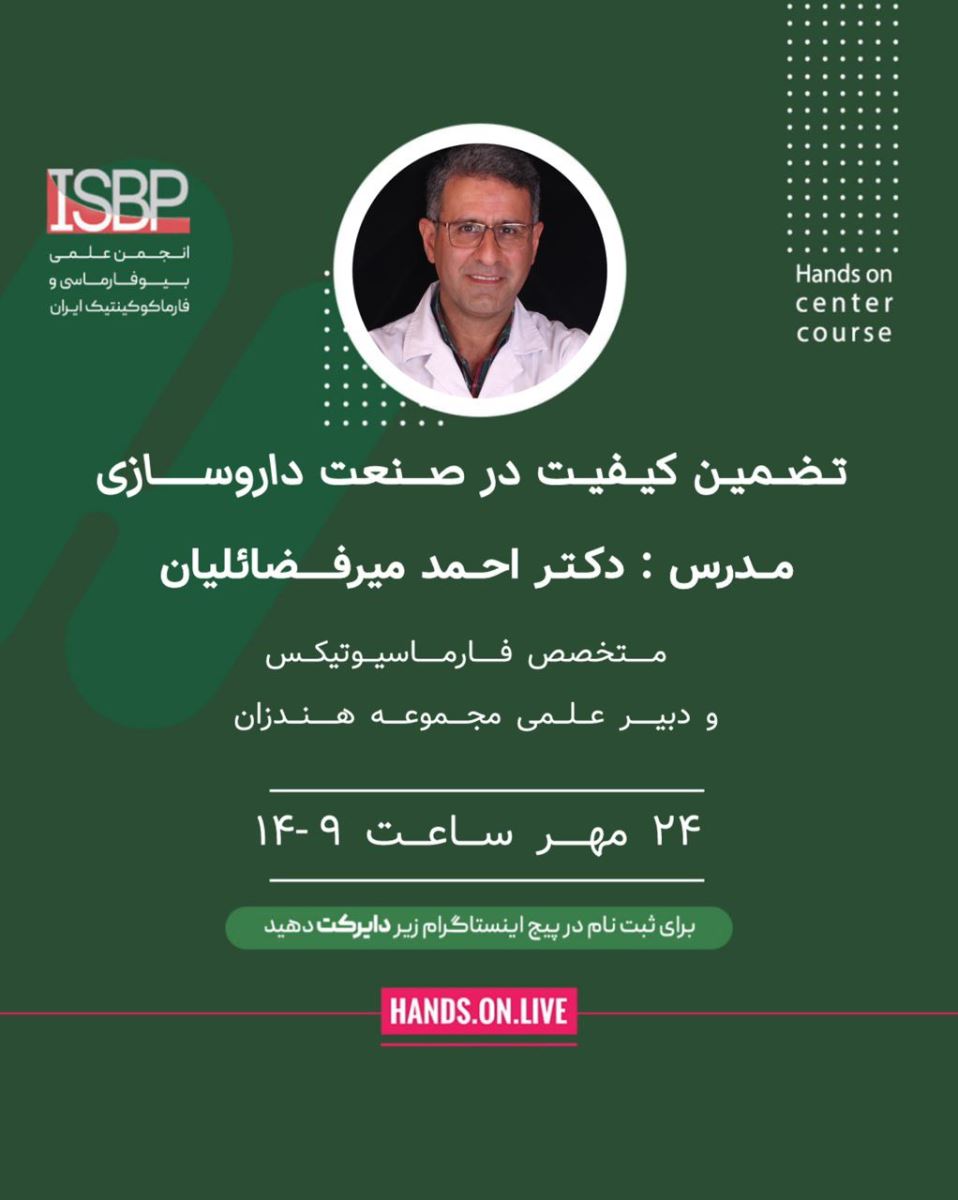 کارگاه آموزشی آنلاین "تضمین کیفیت در صنعت داروسازی" با تدریس جناب آقای دکتر احمد میرفضائلیان، متخصص فارماسیوتیکس و دبیر علمی مجموعه هندزان در تاریخ 24 مهر از ساعت 9 الی 14 برگزار می گردد.