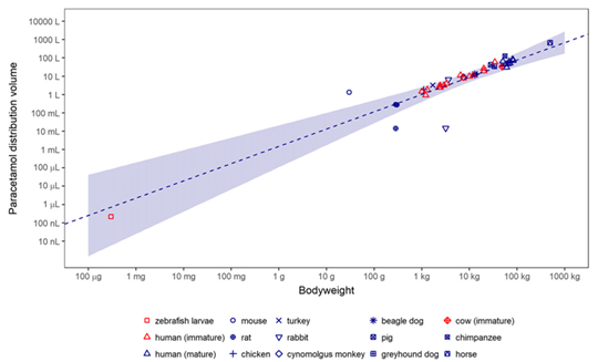 شکل 4 ارتباط میان حجم توزیع استامینوفن در زبرافیش با سایر مدل های حیوانی و انسان.